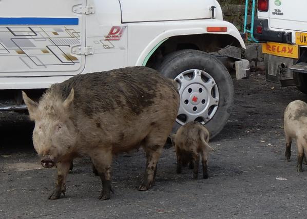 Young monkey in tree during springtime, a vulture and good views, all part of Kausani. Pigs between cars at Gwaldam.